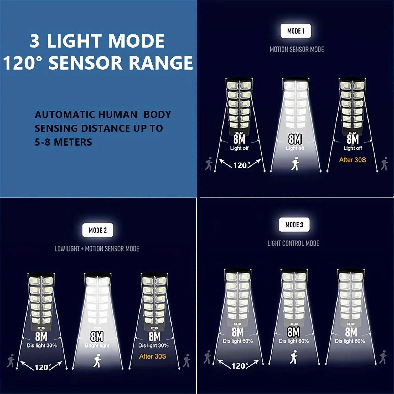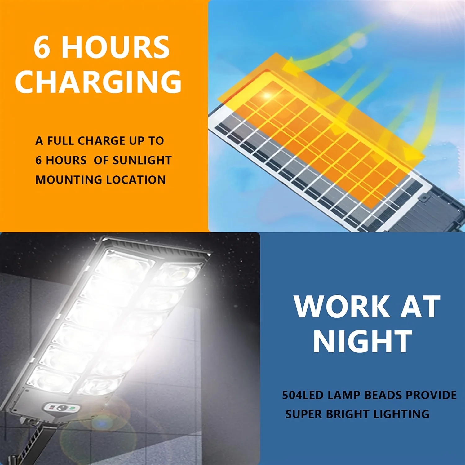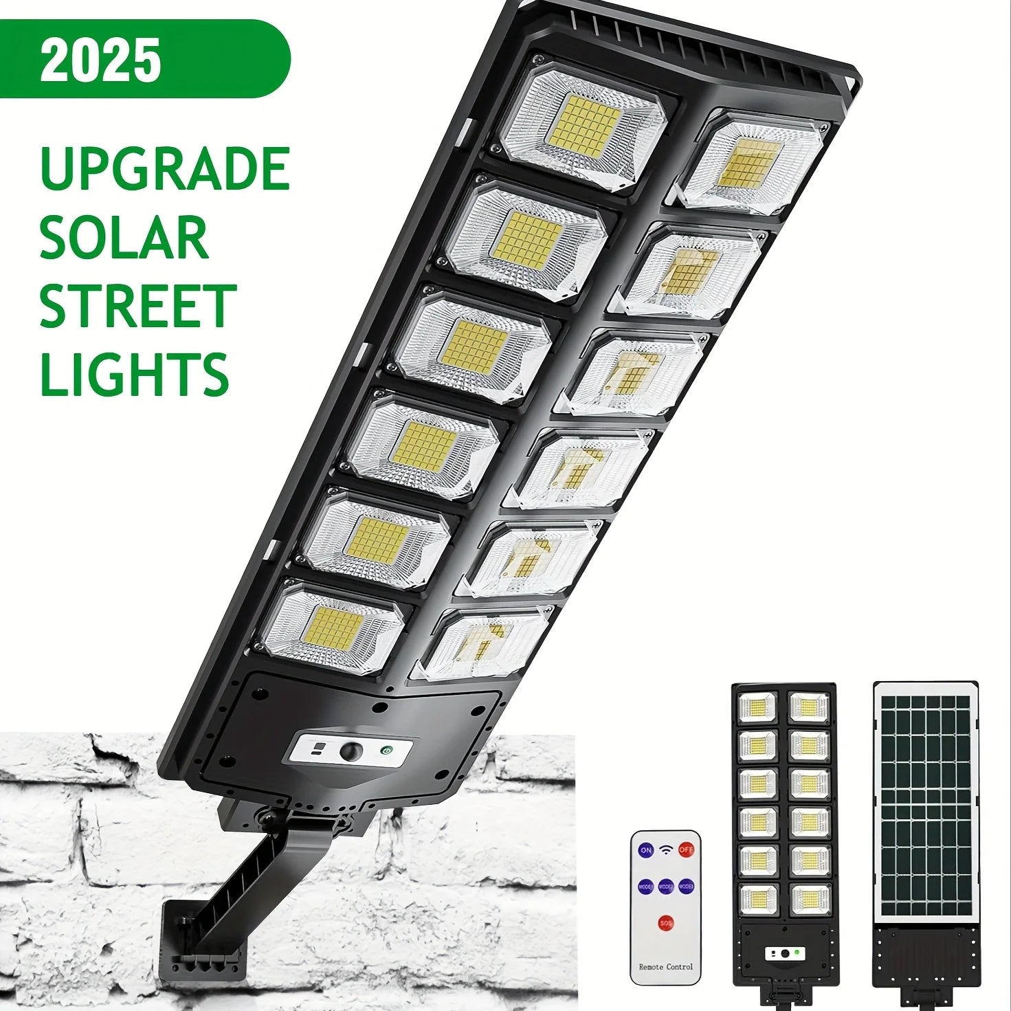 Especificaciones del producto: Esta lámpara de calle solar está fabricada con materiales ABS y PS, proporcionando una luz blanca fría a una temperatura de 6500K. Está diseñada específicamente para montarse en la pared y funciona en tres modos diferentes. En modo de luz constante, ofrece aproximadamente 2 horas de iluminación ininterrumpida, mientras que en modo de detección, puede durar hasta 12 horas. Las características del modelo incluyen 12 cabezales, 504 LEDs y una batería de 6000mAh.
